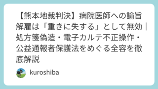 生活 【熊本地裁判決】病院医師への諭旨解雇は「重きに失する」として無効|処方箋偽造・電子カルテ不正操作・公益通報者保護法をめぐる全容を徹底解説
