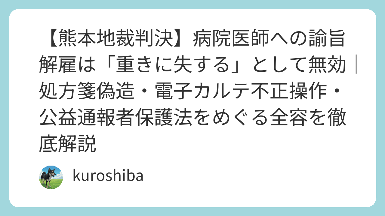 - 同僚医師の処方箋偽造を警察・厚生局に告発した行為は公益通報者保護法第3条により保護され、解雇理由に使えない